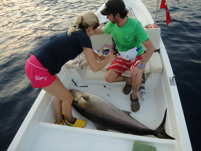 Tekrar sırtı çekmeye başladığımızda, olta taşlara takıldı. Taşlardan hasarsız olarak oltayı kurtarıp, tekrar Akya’nın peşine düştük. Artık güneş batmıştı. Dönme düşünceleri aklımızda belirmişken, kaloma hızla boşalmaya başladı. Kayalara çok yakın olduğumuz için Akya’yı da peşimize takıp derin suya çıktık. Tekneyi kıyıdan açarken Akya ile mücadele bütün şiddeti ile devam ediyordu. 10 – 15 dakika kadar, Akya peşimizde, kıyıdan rölanti hızıyla açıldık. Sonra İlhan’ın Akya’yı çekmesine, elle oltayı çekerek, yardımcı oldum. Arada oltayla çektim. Derken Akya aşağıda gözüktü. Bu ana kadar 20 Kg Akya beklentimiz, Akya’yı tekneye aldığımız o anda şoka dönüştü.